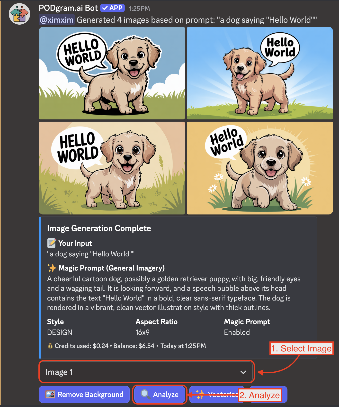 After generating images with the /imagine command, you can analyze any of your images in just two simple actions: