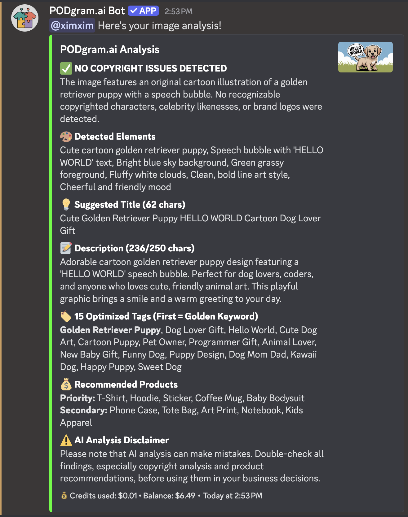 Image analysis costs $0.01 per image - the most affordable way to ensure your designs are ready for market. Check your balance anytime using the /balance command.