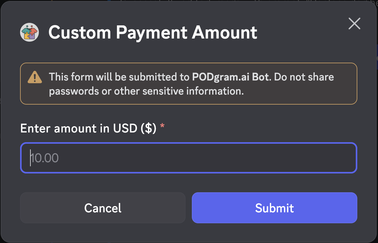 The balance command allows you to check your current credit balance and add funds to your PODgram.ai account directly through Discord.