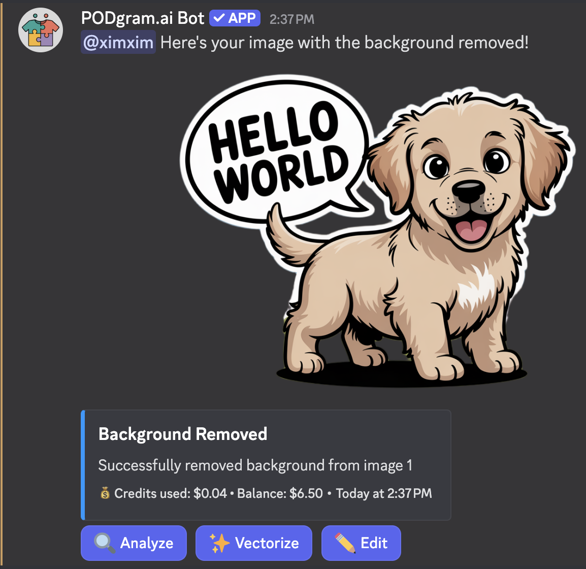 Background removal costs $0.04 per image. Check your balance anytime using the /balance command.