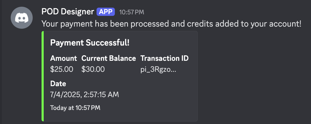 Once your payment is successful, you'll receive a confirmation message in Discord letting you know your credits have been added!