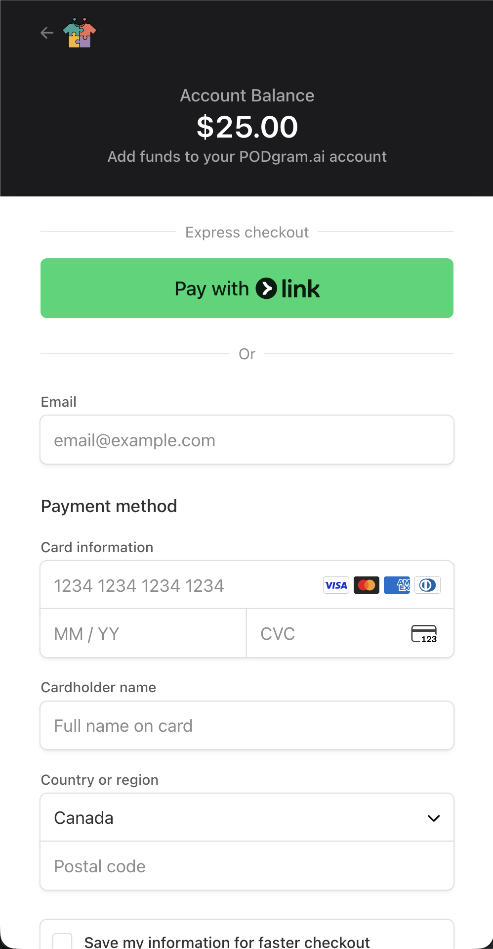 Select how much you'd like to add to your account, then click the "Pay with Stripe" button to proceed to checkout.