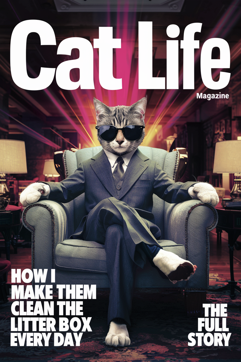 A striking and vivid magazine cover, featuring an anthropomorphic cat exuding wealth and success sitting on an armchair, a paws on each arm. The cat is dressed in a tailored suit and dark sunglasses, striking a confident pose in an opulent living room. The huge magazine modern title in sans-serif font of 'Cat Life' dominates the cover, a smaller mention 'magazine' just under it on the right side, while the big headline 'How I Make Them Clean the Litter Box Every Day' piques the reader's curiosity. The second smaller headline read: 'The full story'. The dynamic lighting enhances Mr. Whiskers' regal presence, making this a truly unique and memorable cover.